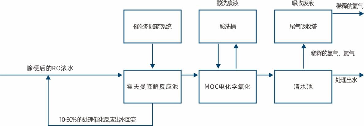 在常規的除油、氣浮、厭氧、好氧反應后,用膜進行深度處理達標排放的同時,會產生大量的膜濃水,由于己內酰胺廢水的性質,濃水的比例可能高達四分之一到三分之一,此時濃水不能簡單的通過回流前端反復處理來提升處理率,通過加裝濃水深度處理系統來處理。